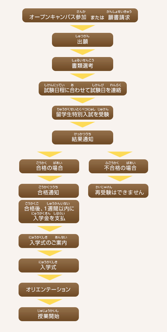※「留学生特別入試」の受験に関しましては、いずれか1回のみとなっております。不合格の際の再受験は通常入試による受験となります。