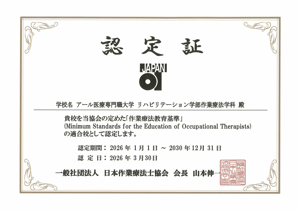 アール医療専門職大学 リハビリテーション学部 作業療法学科が、日本作業療法士協会および世界作業療法士連盟(The World Federation of Occupational Therapists, WFOT)の『作業療法士教育の教育基準』の条件を満たしていることが認められました。世界作業療法士連盟とは、作業療法士の国際機関のことで、作業療法の国際協力の推進を行うことを中心に、作業療法の世界的普及、発展・教育研究水準の維持や改善などを目的とする国際的作業療法士の団体です。WFOTの認定を受けるためには、教員数・カリキュラム・臨床実習時間数などの厚生労働省が定めているものより厳しい基準をクリアしなければなりません。この認定を受けたことにより、作業療法学科の教育課程を修了し、国家資格を取得後は、海外でも作業療法士として活躍することが可能です。今後も、アール医療専門職大学では、日本国内そして世界で活躍できる作業療法士の養成に努めて参ります。